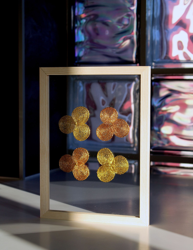 Le tableau brodé “MILIEU DES TERRES” est le premier tableau créé par le Studio Bouclette. Elle s’inspire de la géométrie sacrée, telle que revisitée par la créatrice, et marque le début du projet du studio : explorer la broderie libre, affranchie de tout support, pour révéler chaque détail et observer le fil sous toutes ses coutures.